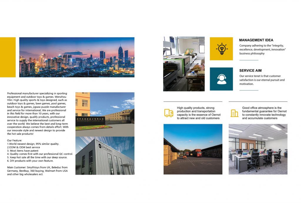 Wenzhou Yilin: High quality sports & toys designed, manufacturer and service for international; We are professional in this field for more than 15 years, with our innovative design, qualify products, professional service to supply the international customers all over the world. We believe the best and long-term cooperation always comes from details effort. With our innovate style and newest design to provide the hot sale products!