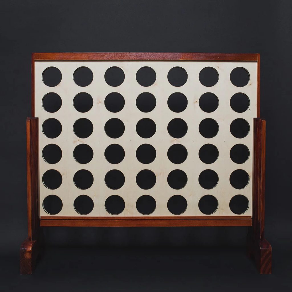 Giant connect four game comes with: 31″ x 23″ wooden board, beautifully finished legs and frame, 21 red and 21 blue 3.5″ plastic coins, and a nylon carrying case.