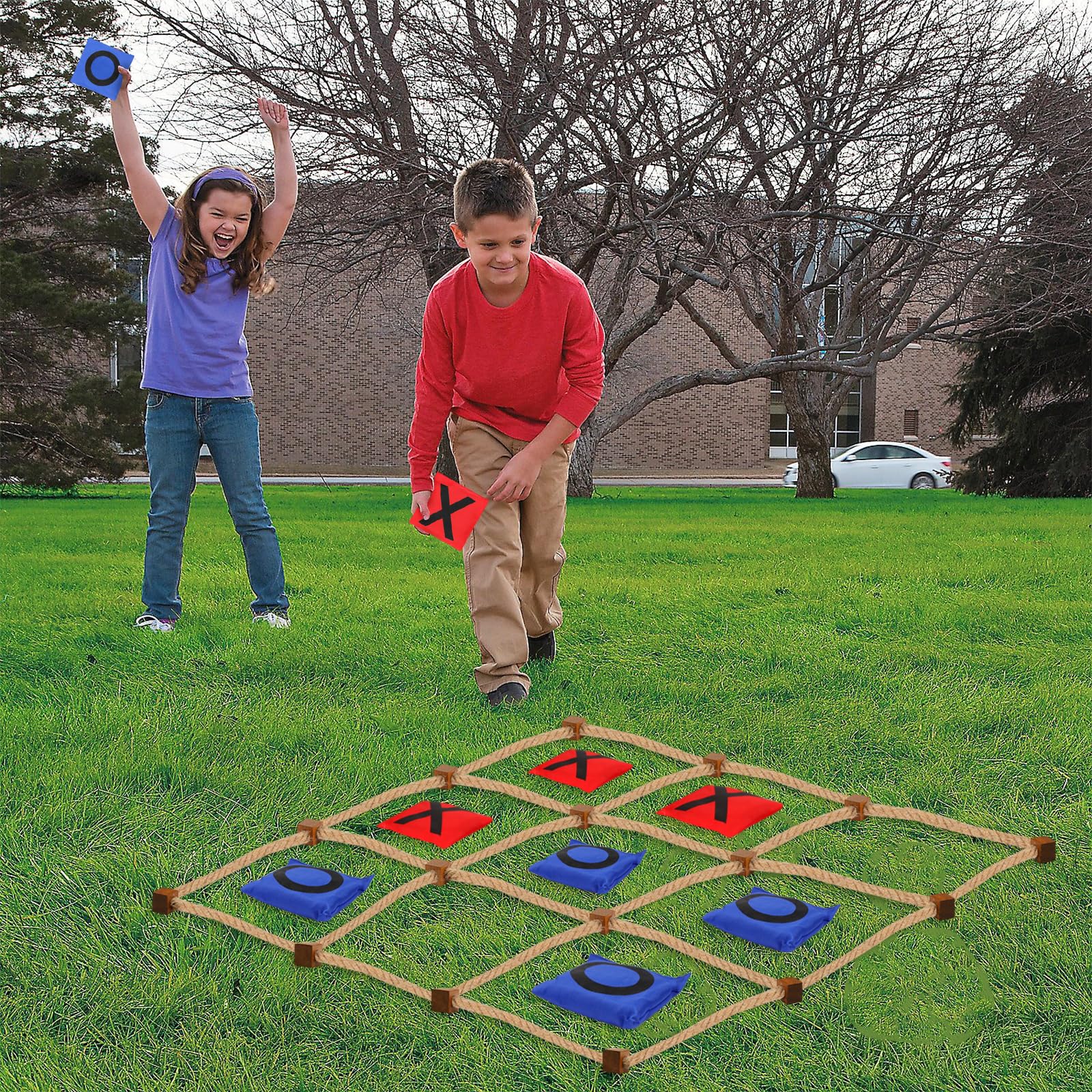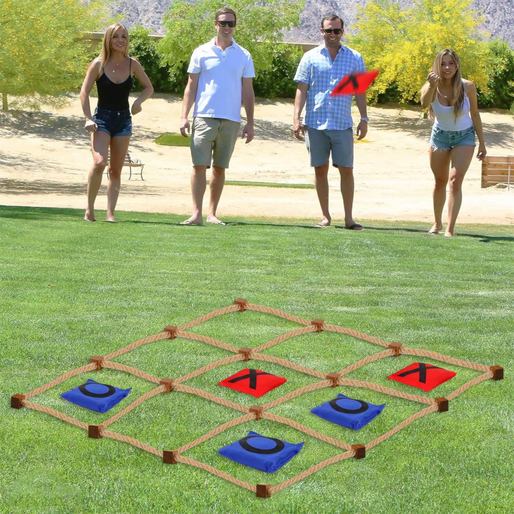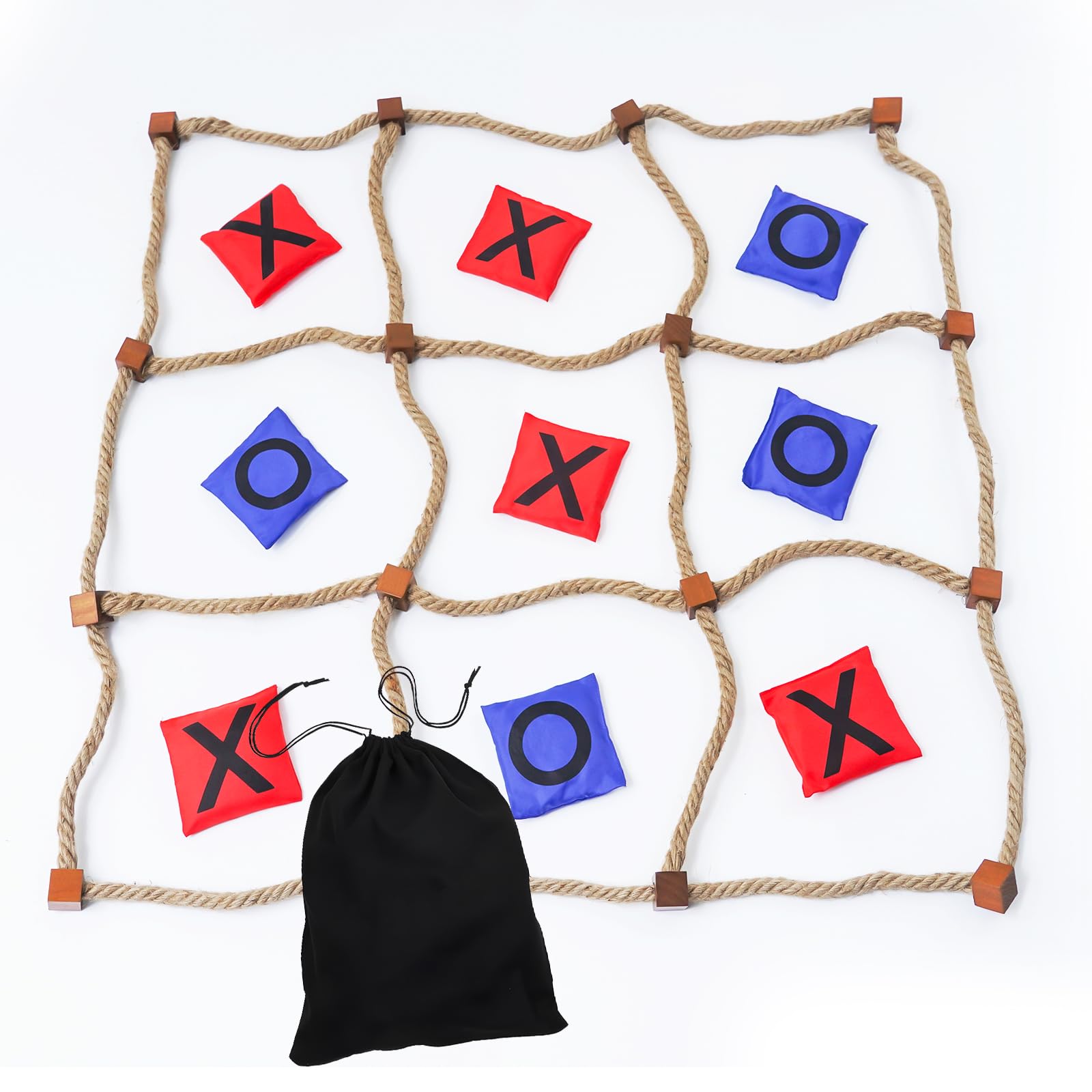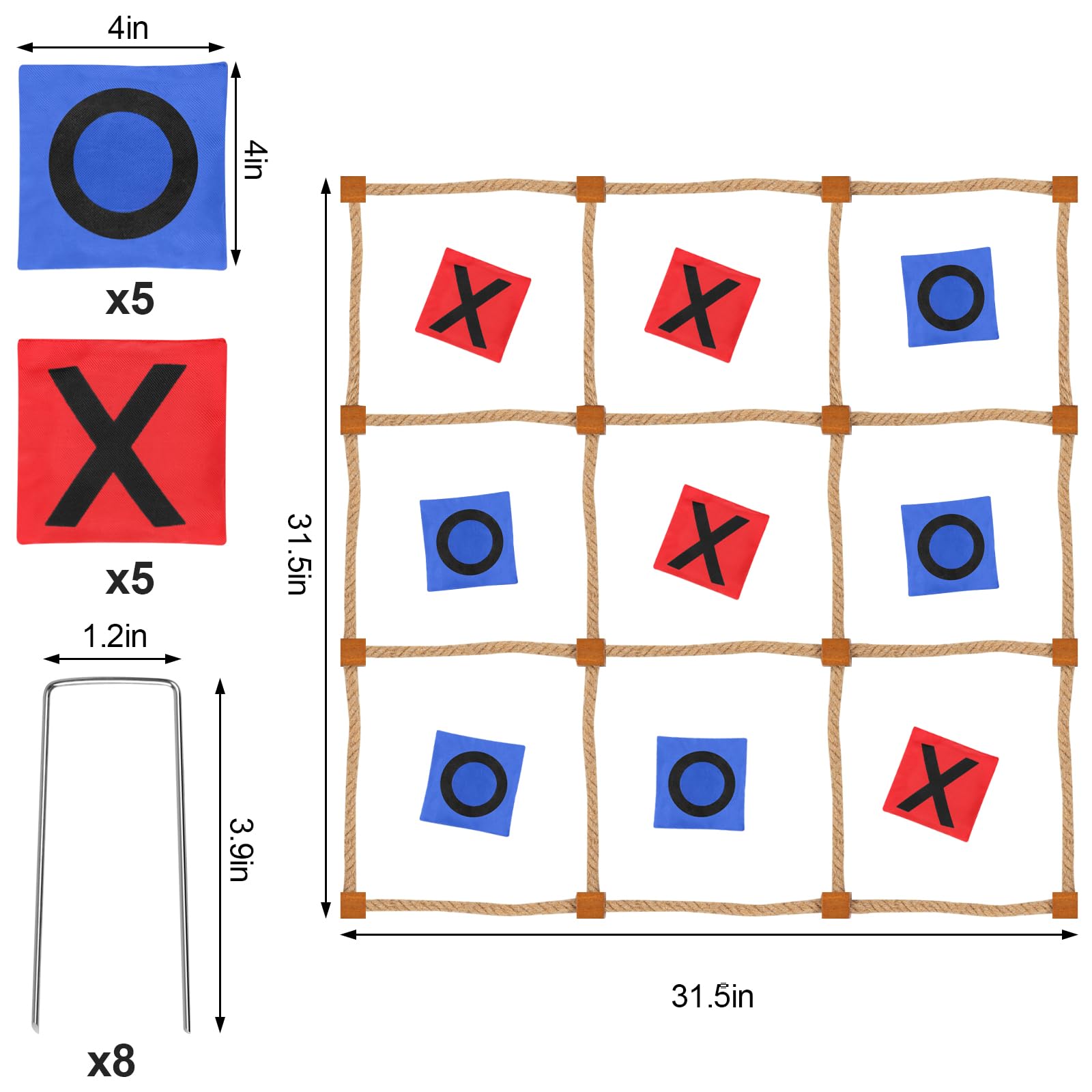 【Set Includes】Jumbo game board reinforced with durable rope and poplar wood. 2.63ft x 2.63ft, Includes 5 X’s and 5 O bean bags, 4 spikes and a storage bag.